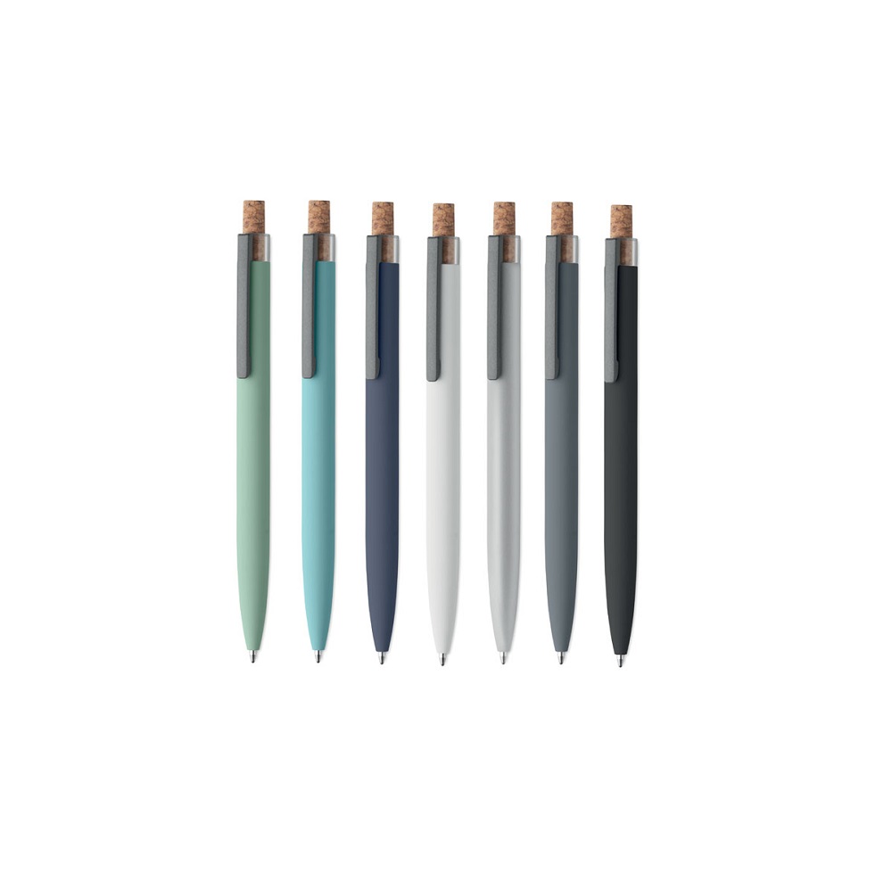 Długopis z aluminium pochodzącego z recyklingu z korkowym przyciskiem i metalowym klipem. Niebieski tusz.