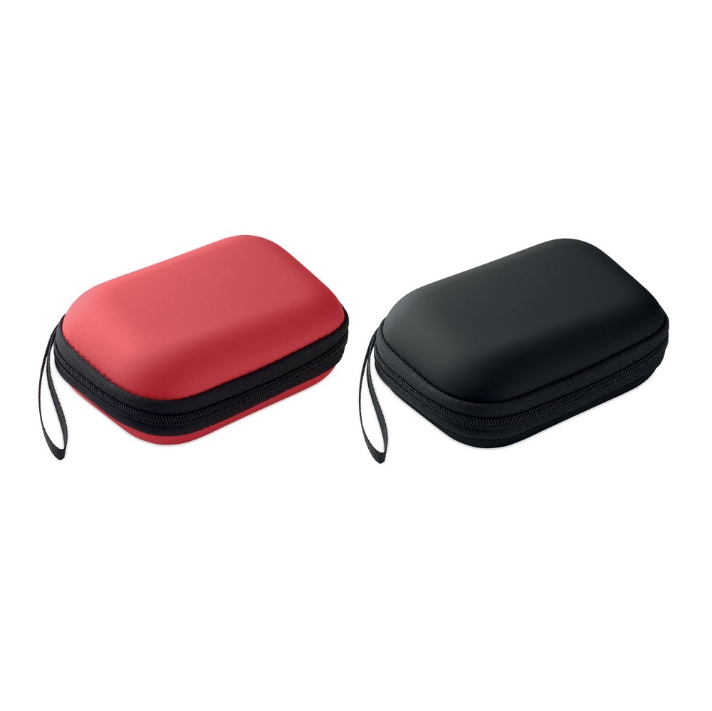 Apteczka pierwszej pomocy w twardym etui z PU. Zawiera 2 rękawiczki, 1 koc, 1 taśmę, 2 bandaże, 1 nożyczki, 4 waciki, 10 plastrów i 6 chusteczek czyszczących. Niedostępna w sprzedaży poza UE.