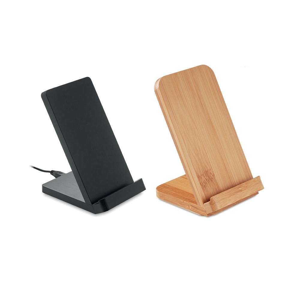 Bezprzewodowa ładowarka z podwójną cewką dla 1 urządzenia w bambusowej obudowie i funkcją podstawki. Umieść na niej smartfon, aby rozpocząć ładowanie. Wyjście: DC5V/1A (15W).