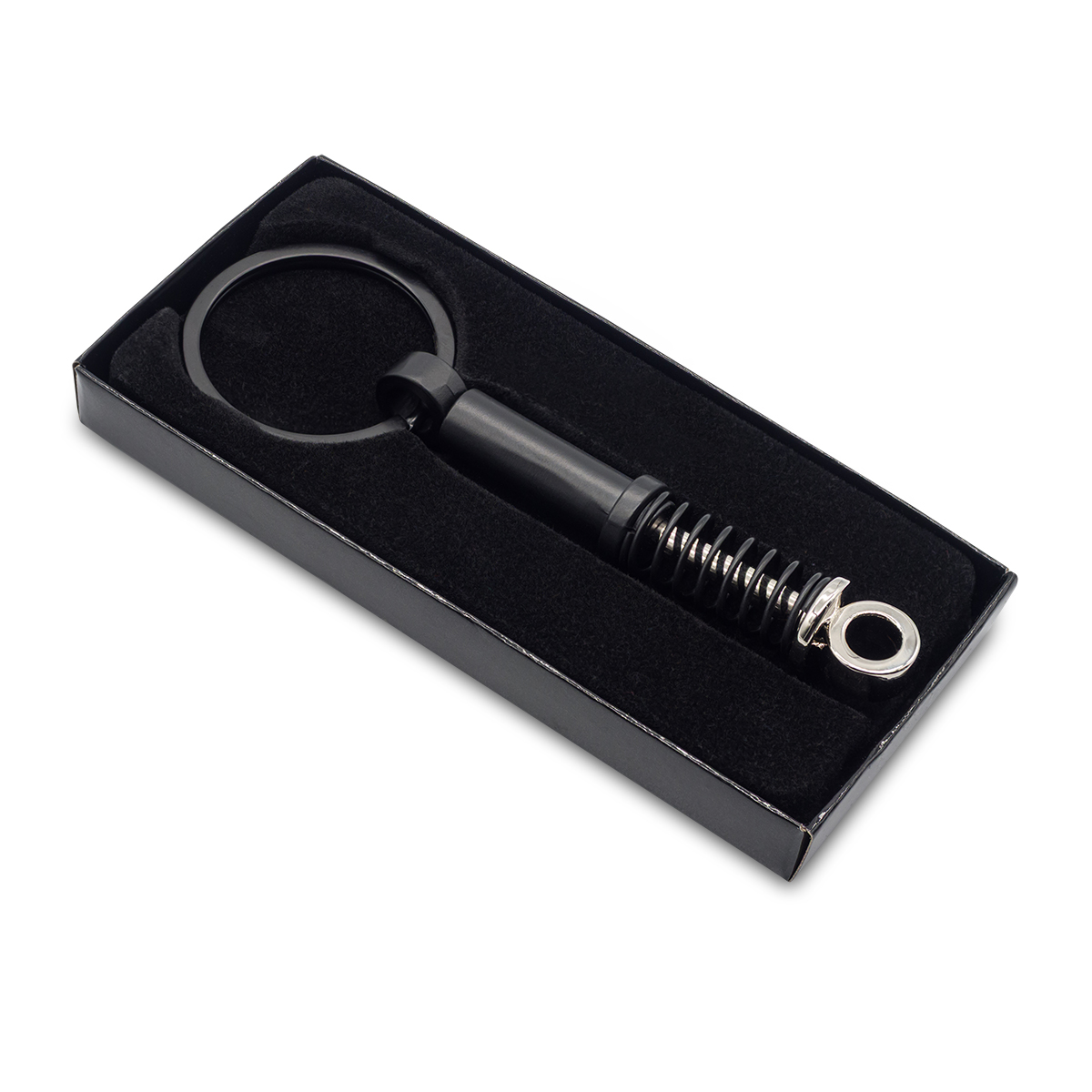 Brelok w kształcie amortyzatora. Wykonany z metalu w kolorze czarnym z widoczną, sprężynową konstrukcją. Pakowany w czarne opakowanie upominkowe.