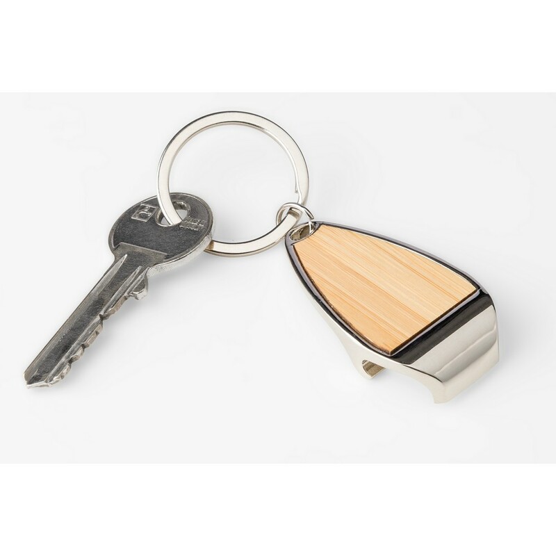 Brelok do kluczy, otwieracz do butelek, zapakowany w papierowy kartonik, produkt wykonany z metalu i bambusa