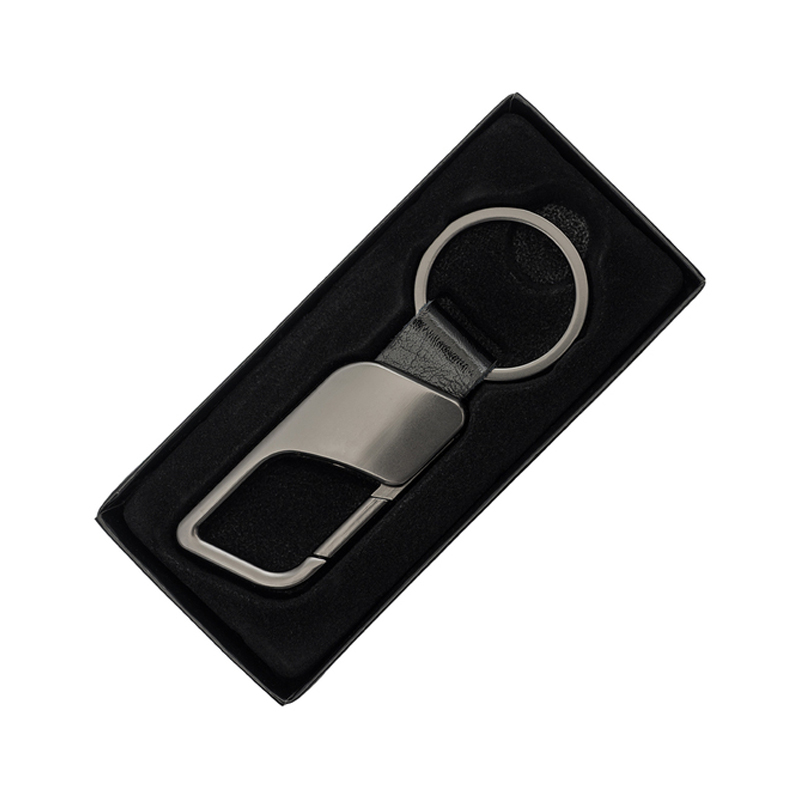 Brelok będący eleganckim połączeniem metalu w kolorze grafitowym i ekoskóry z karabińczykiem. Pakowany w czarne opakowanie upominkowe.