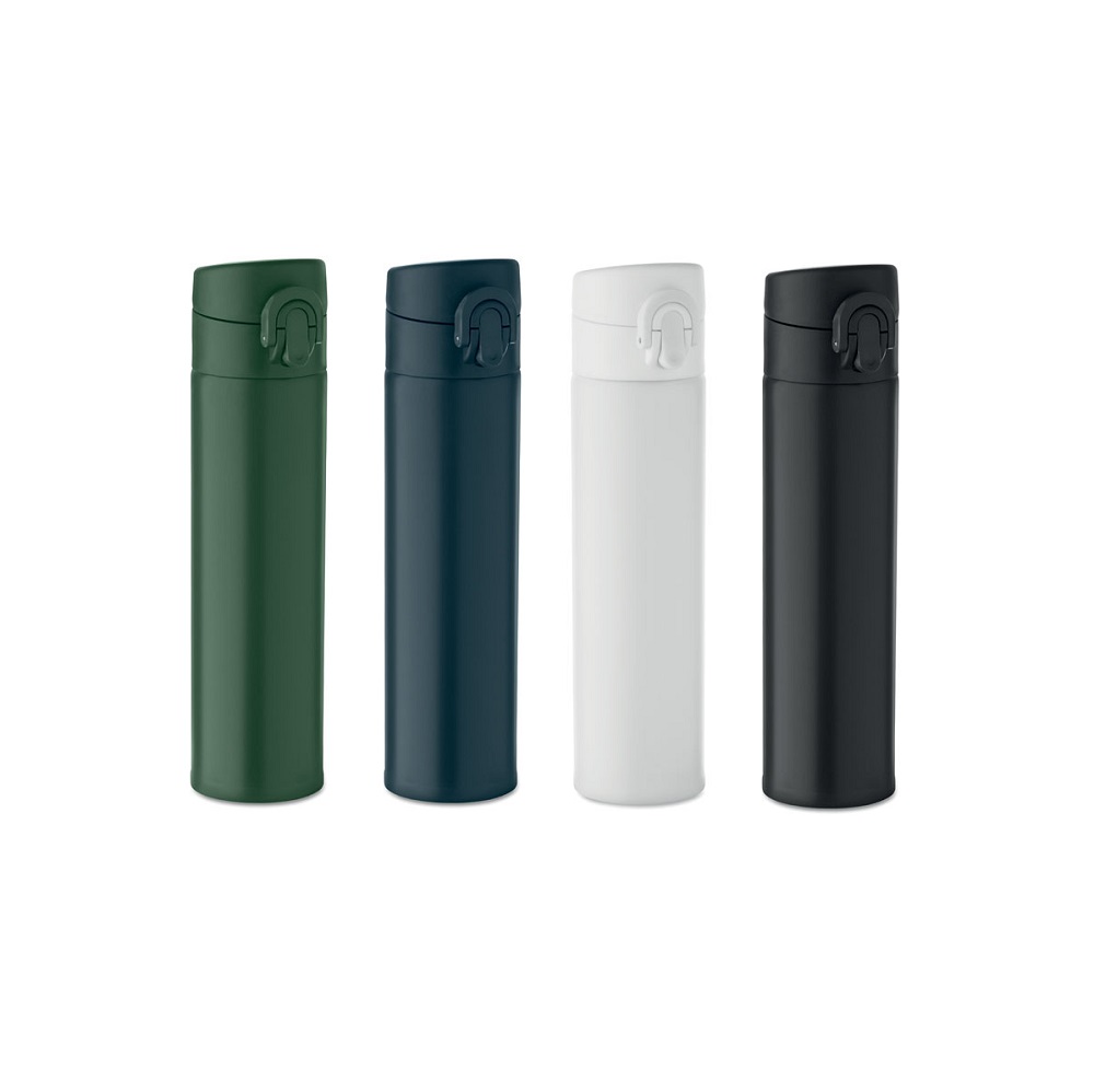Butelka z podwójnymi ściankami ze stali nierdzewnej pochodzącej z recyklingu (90% stali nierdzewnej pochodzącej z recyklingu i 10% stali nierdzewnej) z zamkiem zabezpieczającym na pokrywie i opcją otwierania przez naciśnięcie. Nie przecieka. Pojemność: 300 ml.