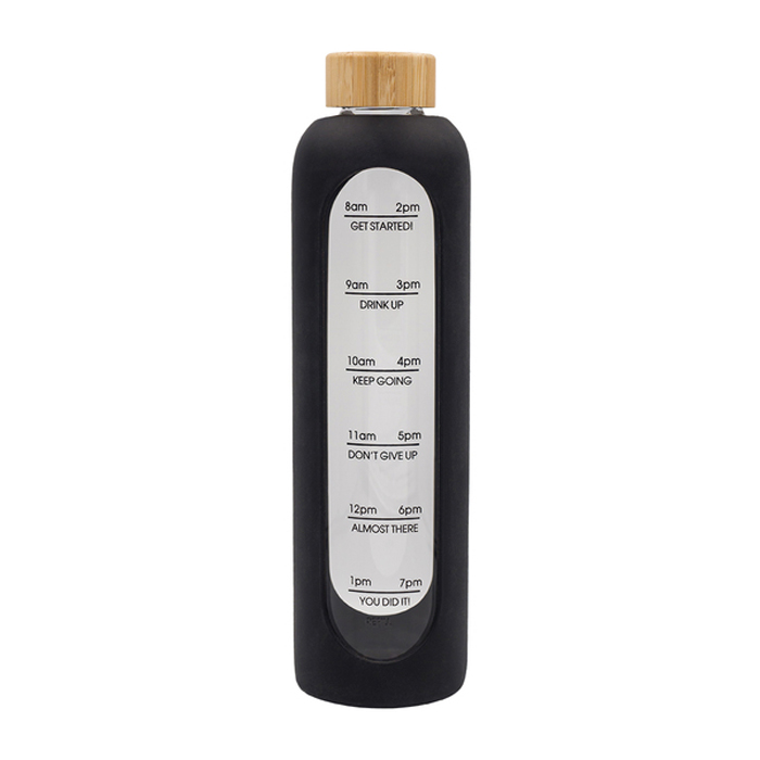Szczelna butelka ze szkła borokrzemowego w silikonowym etui i bambusową nakrętką. Pojemność 1100 ml.