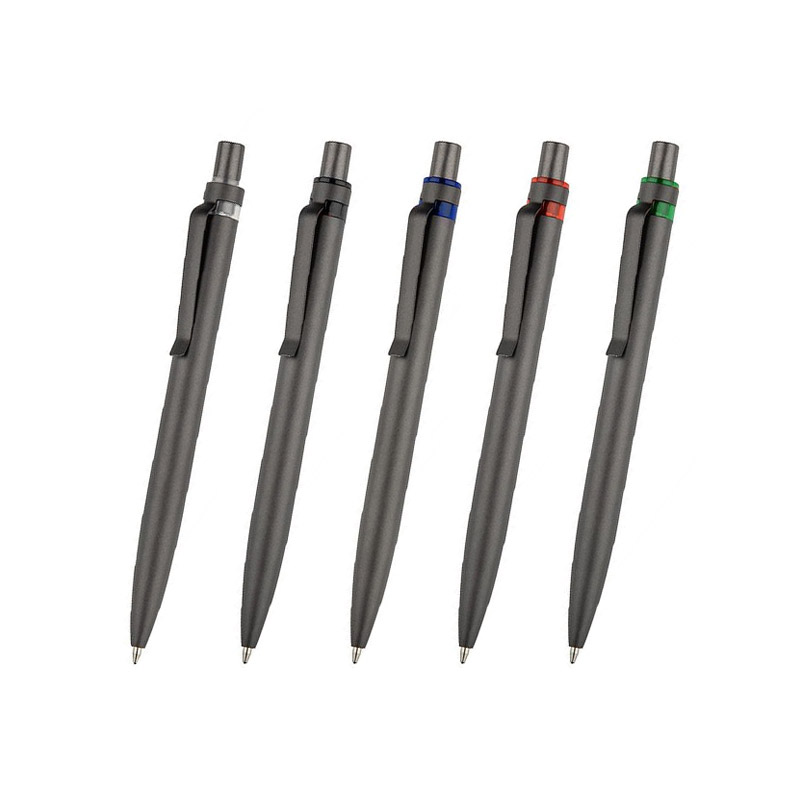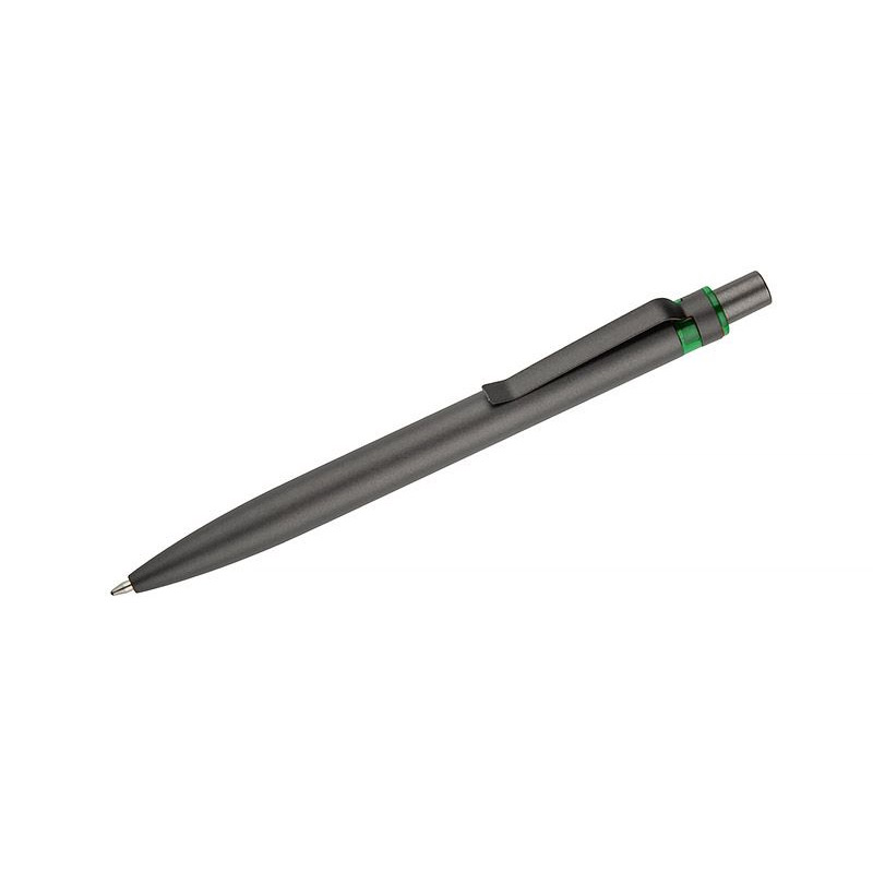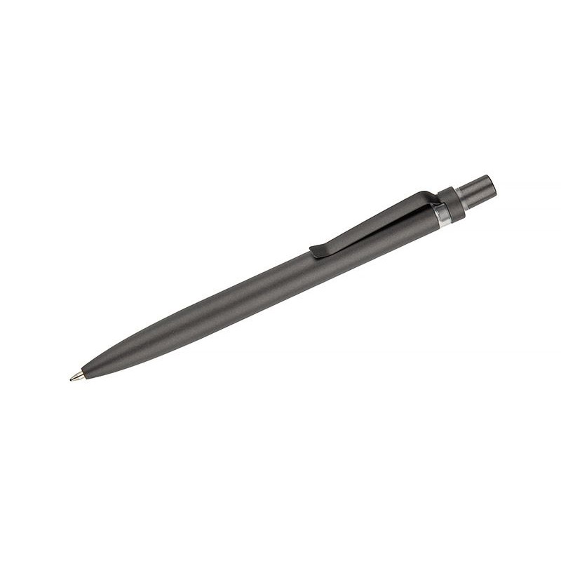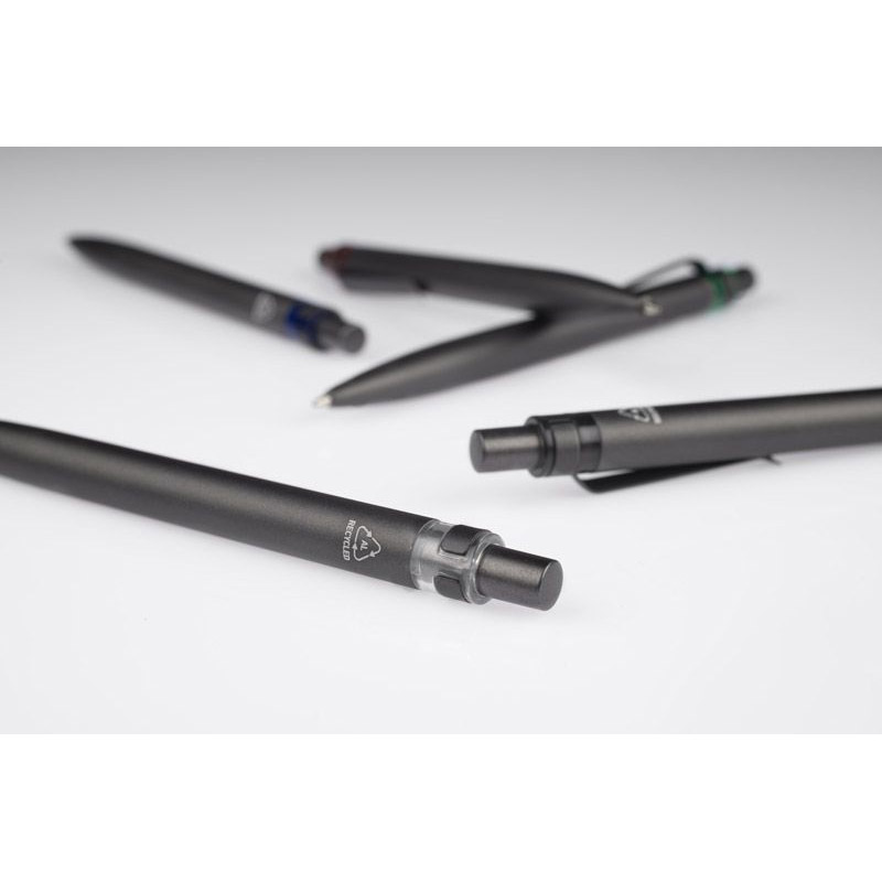 Długopis RAL wykonany jest z recyklingowanego aluminium w eleganckim, grafitowym kolorze z chromowanym wykończeniem. Aluminiowy klips zakończony kolorowym akcentem nadaje mu nowoczesny i rozpoznawalny wygląd. Mechanizm wysuwu jest automatyczny, co zapewnia wygodę i szybkie użycie w każdej sytuacji. Smukła forma oraz przyjemny w dotyku korpus gwarantują komfort pisania. Wkład typu G2 o grubości linii 1,0 mm zapewnia płynny i precyzyjny zapis. To praktyczny gadżet reklamowy, który świetnie sprawdzi się w biurze i podczas spotkań biznesowych.
