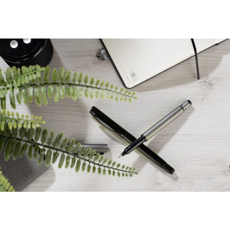 Długopis ROTIS to aluminiowy model z żelowym wkładem typu free ink, zamykany klasyczną zatyczką. Korpus o półmatowym wykończeniu uzupełnia czarny, metalowy klips, który dodaje elegancji. Obrotowa końcówka z wbudowanym spinnerem pełni funkcję antystresową – umieszczona na niej czarna strzałka, wytłoczona w materiale, subtelnie sugeruje kierunek obrotu.