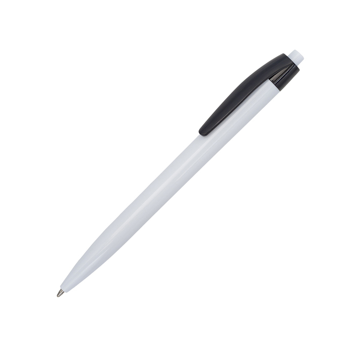 Plastikowy długopis wyposażony w niebieski wkład.