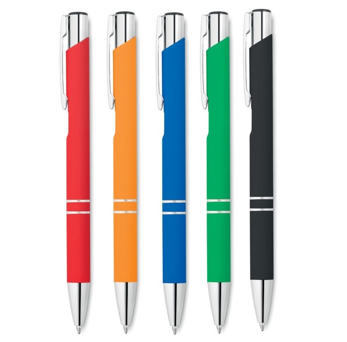 Przyciskany długopis z gumowym wykończeniem, wyposażony w błyszczące elementy. Niebieski wkład.