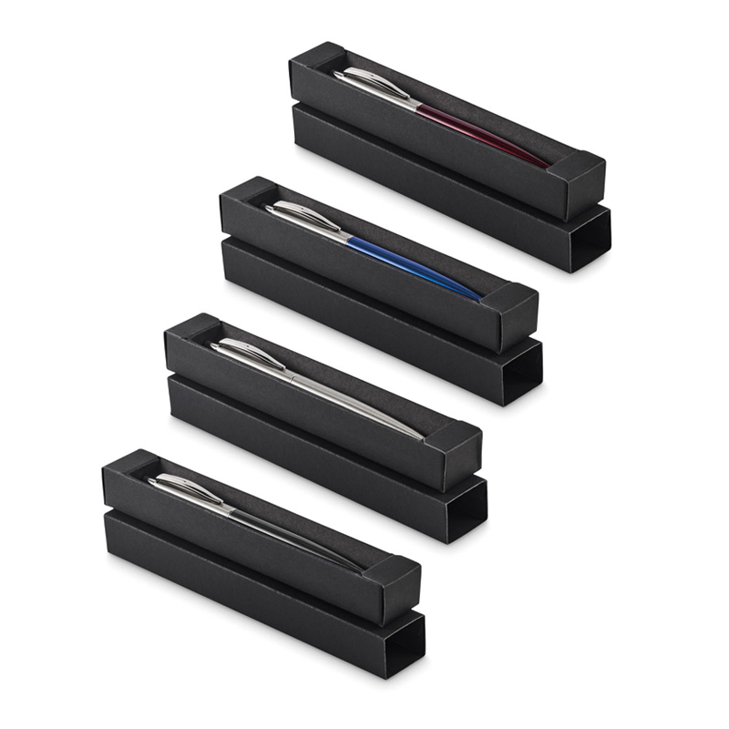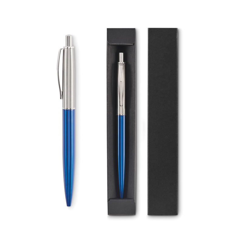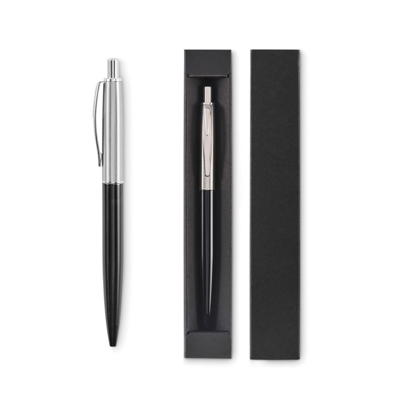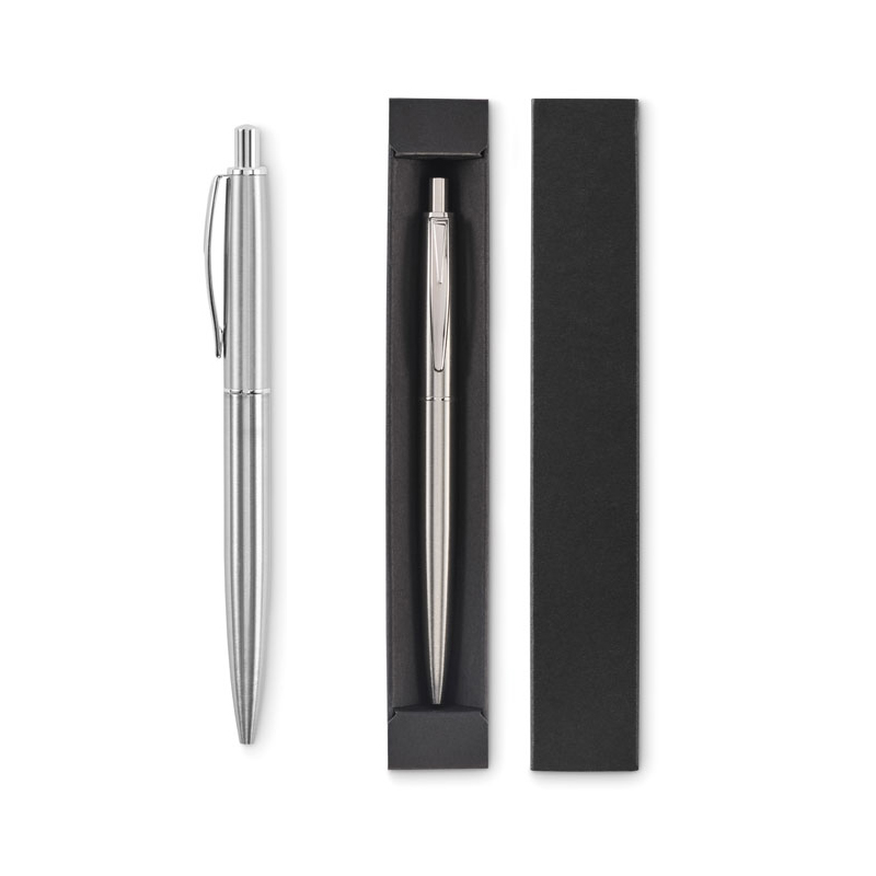 Przyciskany długopis z korpusem z recyklingowanej stali nierdzewnej. Niebieski tusz. Prezentowany w czarnym pudełku.