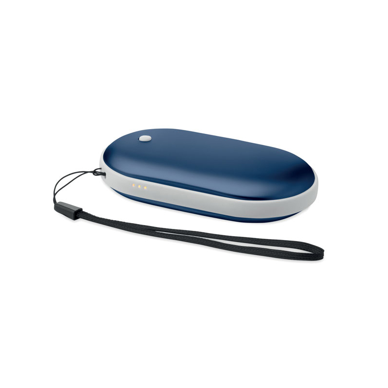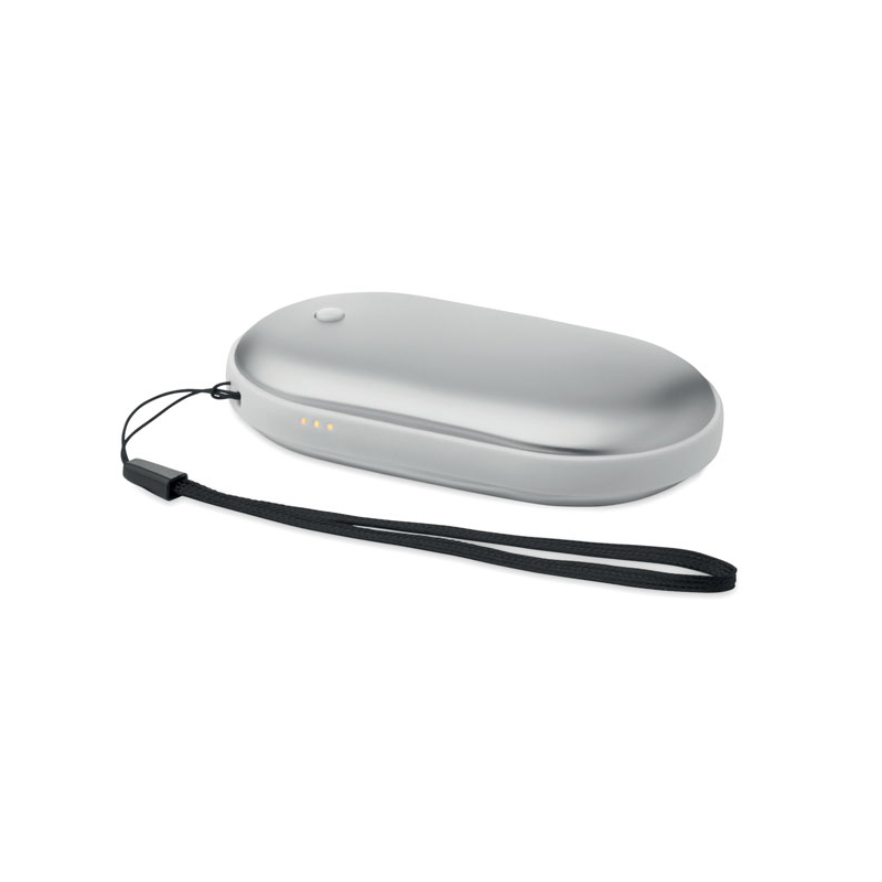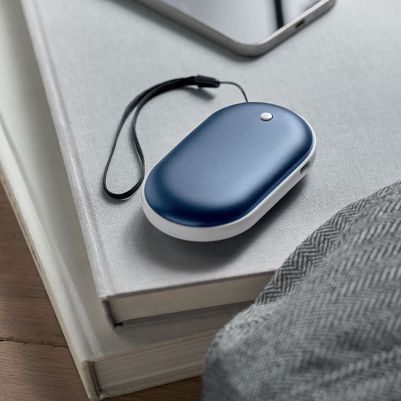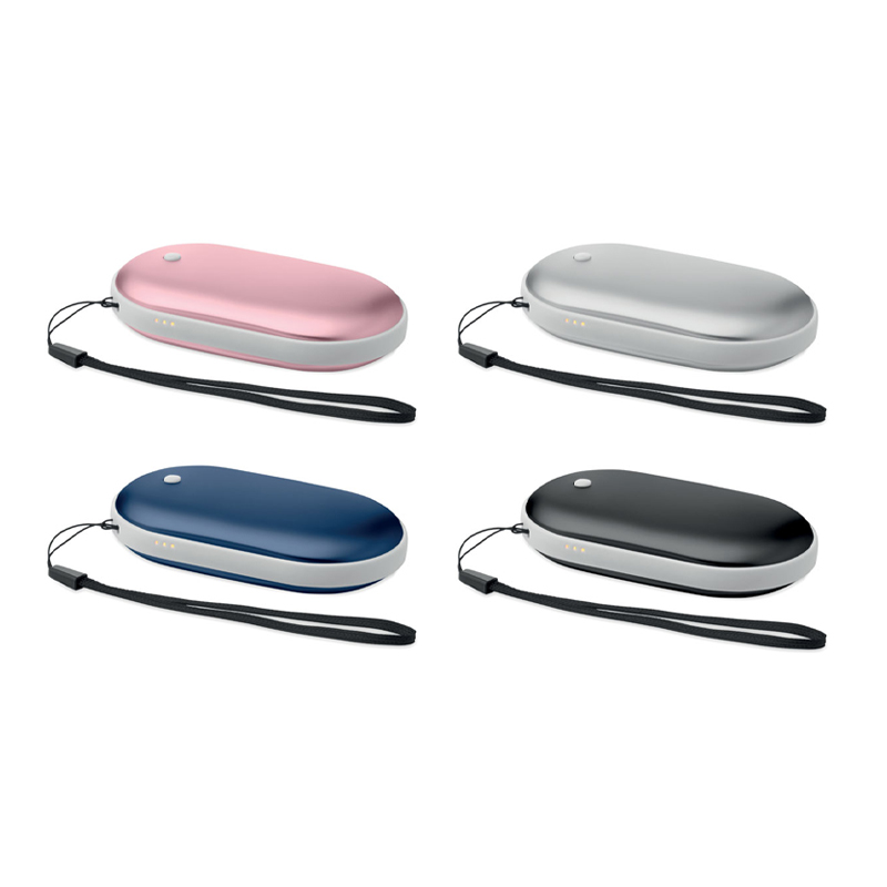 Aluminiowy elektryczny ogrzewacz do rąk z 3 poziomami grzania (45°C, 50°C, 55°C) i powerbankiem 5000 mAh. Dwustronne ogrzewanie, wejście/wyjście typu C, wyjście USB-A i DC5V/2A oraz kabel w zestawie.