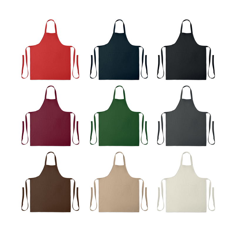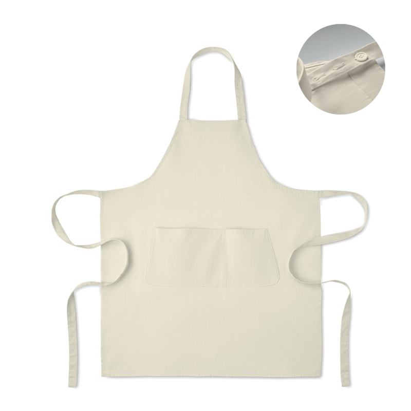 Fartuch z 1 dużą kieszenią z przodu i 2 przegrodami z bawełny organicznej 240 gr/m². Regulowane zapięcie na guzik na pasku na szyję.
