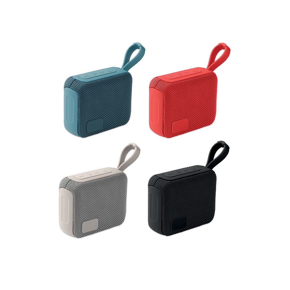 5.0 bezprzewodowy głośnik z ABS z tkaniną RPET i sznurkiem do zawieszania. 1 akumulator Li-ION 800 mAh w zestawie. Zawiera port karty SD i kabel AUX/USB. Dane wyjściowe: 5W, 3 Ohm i 5V. Czas odtwarzania ok. 3 godz