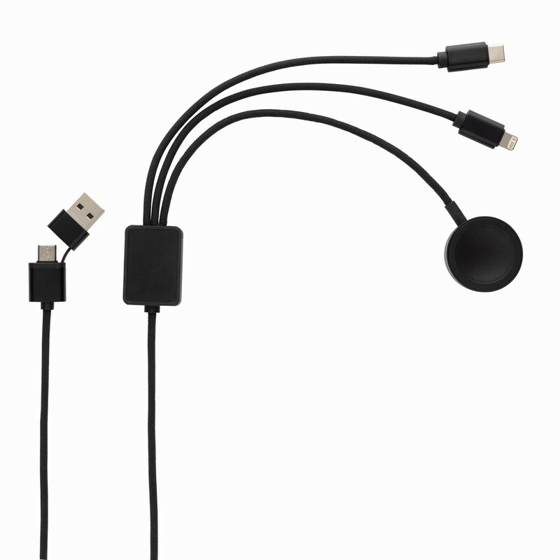 Kabel do ładowania 6 w 1 Terra, bezprzewodowa ładowarka do zegarka, wykonany z recyklingowanego aluminium, PET, ABS i TPE z certyfikatem RCS, podwójne wejście: USB-A i USB-C, podwójne wyjście: Lightning i USB-C, ładowarka 2,5W do zegarków (Apple Watch, Samsung Watch), pleciony kabel z PET o długości 120 cm, obsługuje ładowanie do 5V/2A, opakowanie FSC® mix