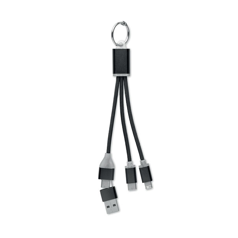 Brelok do kluczy z kablami do ładowania z wejściem: 2 w 1 typu C i typu A oraz micro-B (2 w 1 pin) i wyjściem typu C.