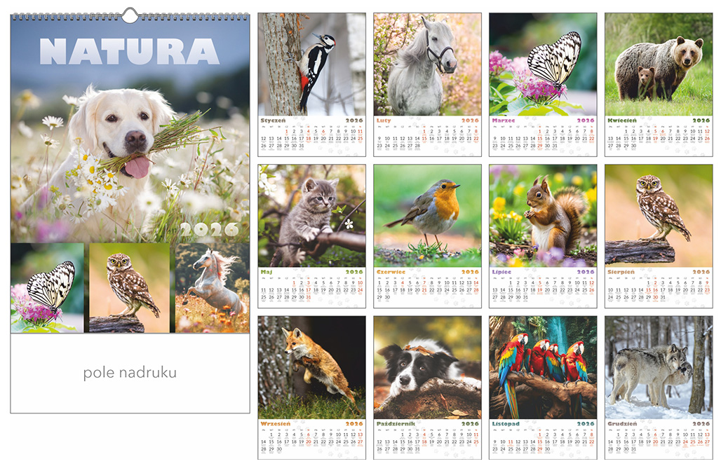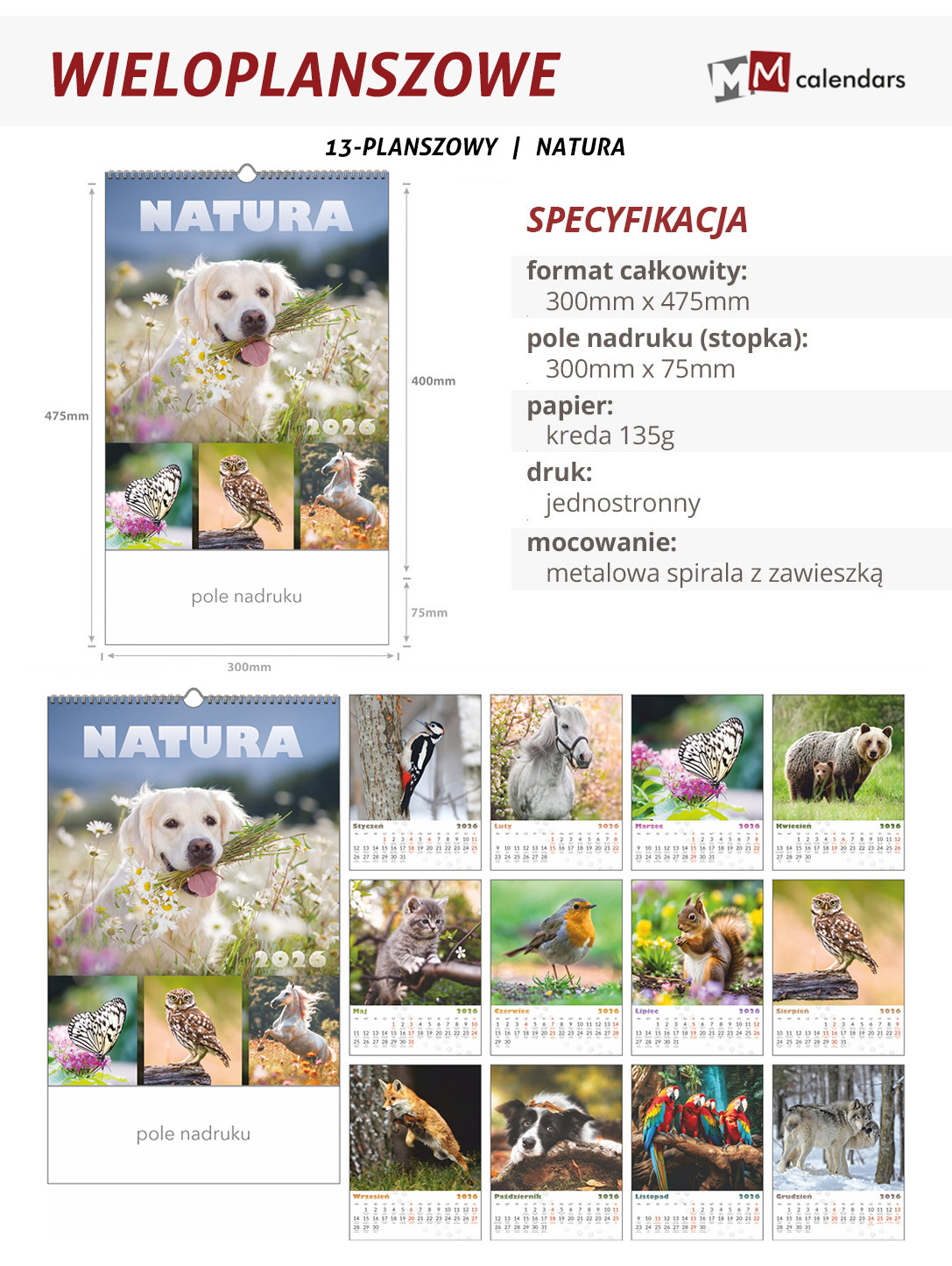 Kalendarz 13-planszowy z możliwością naniesienia własnego logo.