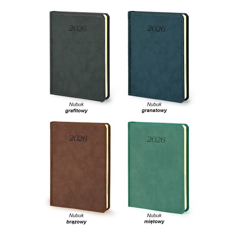 Kalendarz A5 z zaokrąglonymi rogami. Dostępny w oprawie w czterech różnych kolorach.