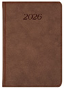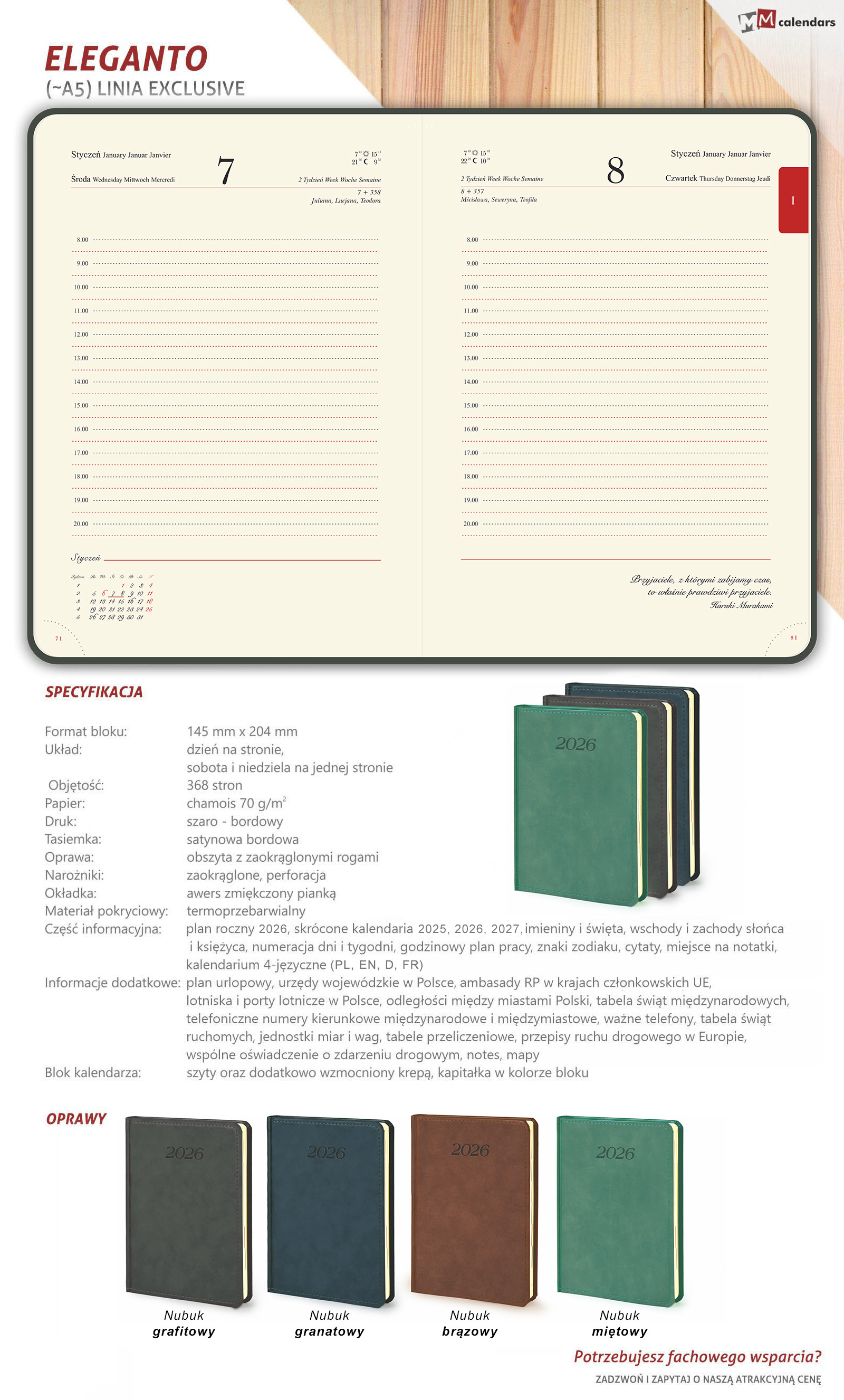 Część informacyjna: plan roczny 2026, skrócone kalendaria 2025, 2026, 2027, imieniny i święta, wschody i zachody słońca i księżyca, numeracja dni i tygodni, godzinowy plan pracy, miejsce na notatki, kalendarium 4-języczne (PL, EN, D, FR)