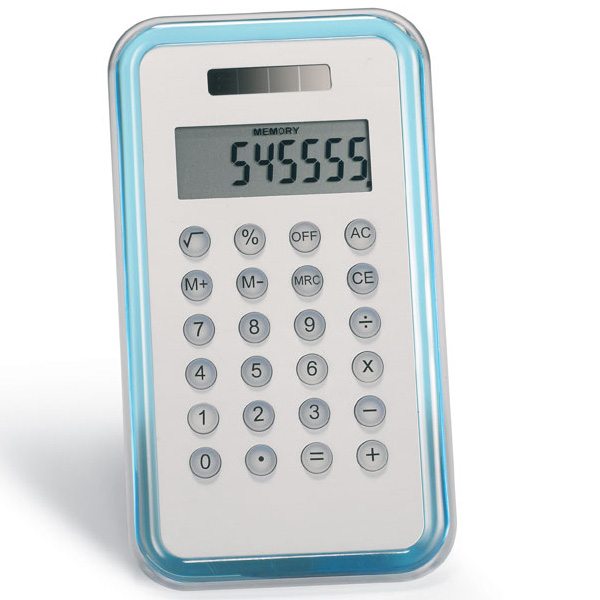 Kalkulator z wyświetlaczem na 8 pozycji, podwójnie zasilany, akryl i aluminium. 1 bateria dołączona.