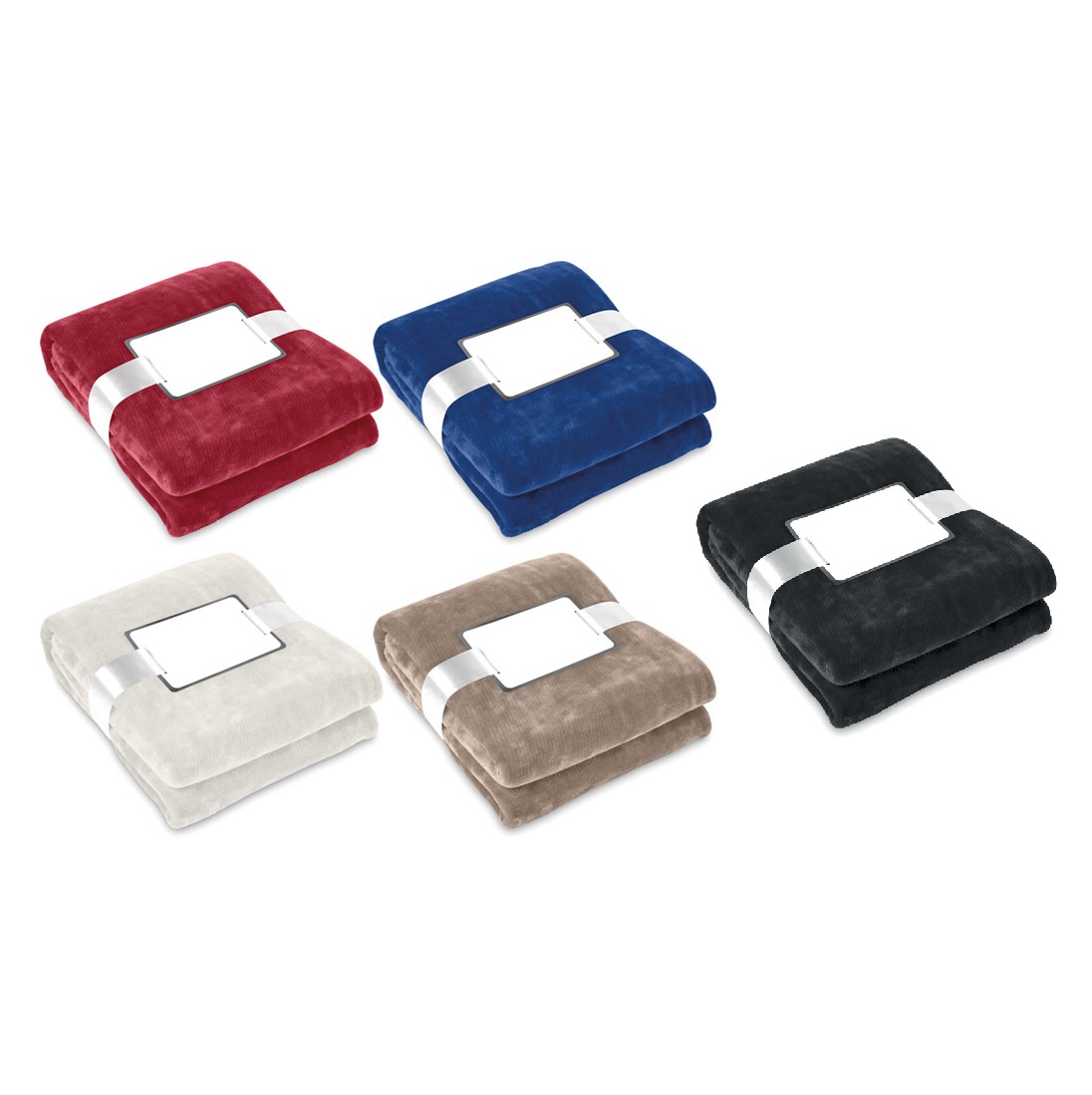 Koc 280g/m2 z miłego, miękkiego polaru, przewiązany wstążką, posiada bilecik do nadruku.