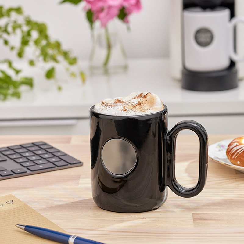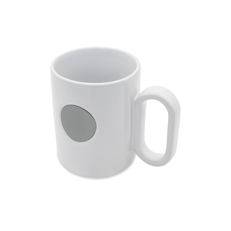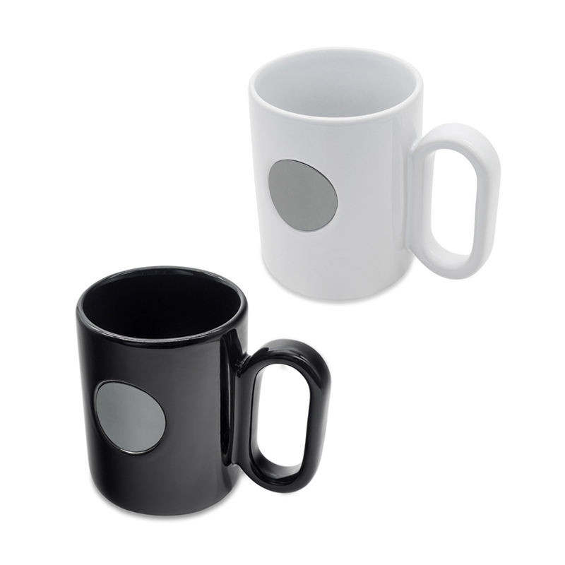 Stylowy kubek ceramiczny o błyszczącej powierzchni, która nadaje mu nowoczesny, elegancki wygląd. Z przodu znajduje się metalowy okrągły element w kolorze grafitowym (gun metal), idealny pod grawer. Ergonomiczny uchwyt zapewnia wygodę użytkowania. Pojemność 480 ml.