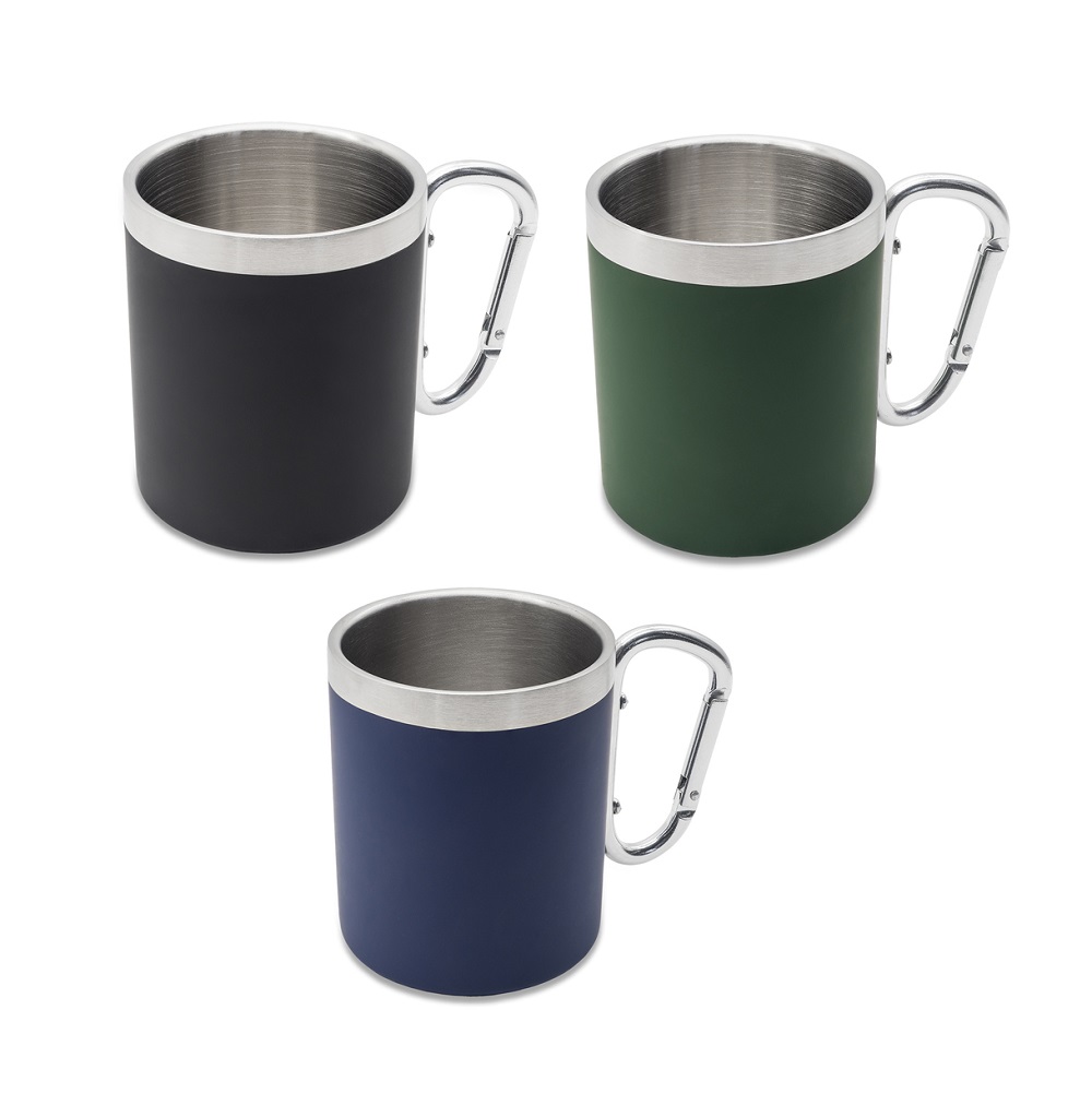 Kubek ze stali nierdzewnej o podwójnych ściankach, o przyjemnej w dotyku powierzchni. Kubek posiada uchwyt w formie karabińczyka. Pojemność: 300 ml.
