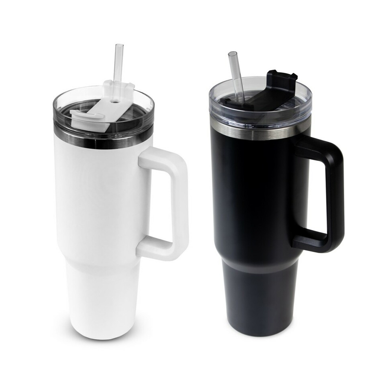 Kubek termiczny 1200 ml ze słomką i ergonomicznym uchwytem, posiada podwójne ścianki ze stali nierdzewnej z próżnią między ściankami, co spowalnia oddawanie temperatury na zewnątrz, zachowując funkcje termosu, produkt wykonany ze stali nierdzewnej i plastiku, utrzymuje temperaturę napojów gorących do 15 godzin, w opakowaniu wykonanym z kartonu kraftowego