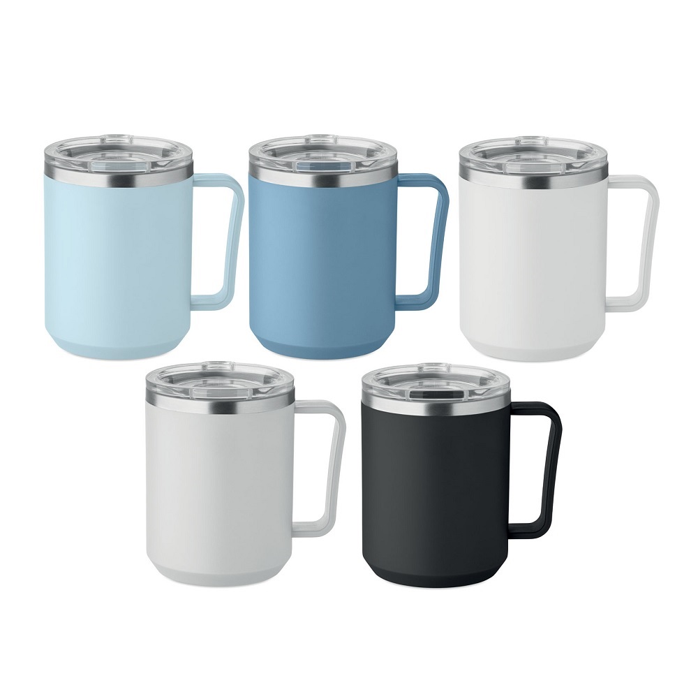 Kubek o podwójnych ściankach. Wnętrze 90% stal nierdzewna z recyklingu i 10% stal nierdzewna oraz zewnętrzna ścianka z PP z recyklingu. Ma przezroczystą pokrywkę przesuwną AS. Pojemność 400 ml.