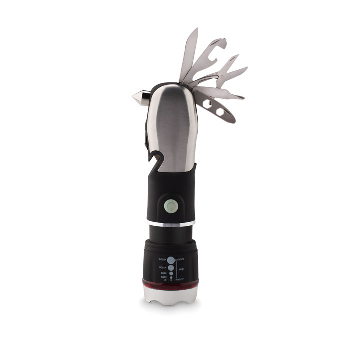 Latarka wielofunkcyjna, młotek bezpieczeństwa i nóż, wbudowanych 9 narzędzi funkcyjnych. Wykonana z ABS z gumowanym wykończeniem. 3 funkcje światła z funkcją zoom. Baterie nie dołączone.