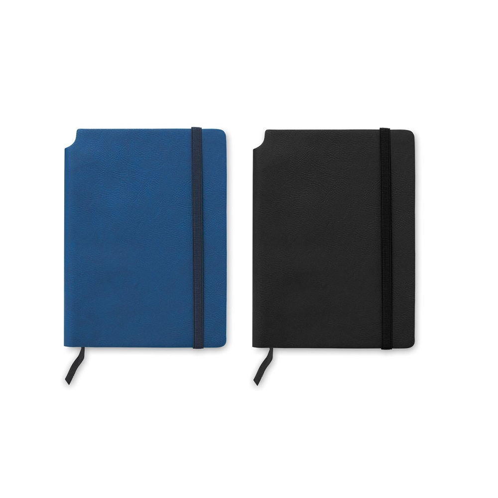 Notatnik A5 z miękką okładką z PU. Oprawiony w pudełko. 160 stron w linie z papieru z recyklingu (80 arkuszy). Dopasowany elastyczny pasek i zakładka ze wstążki. Rozszerzana kieszeń wewnętrzna z tyłu. Uchwyt na długopis na grzbiecie.