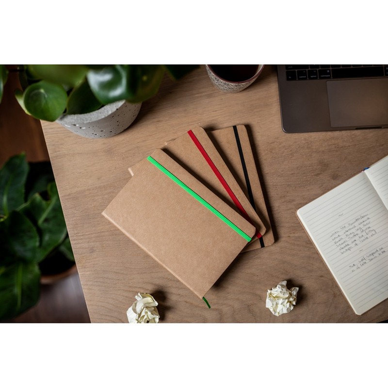 Notatnik w formacie ok. A5, posiada 96 kremowych kartek w linie (192 strony), tasiemka zakładkowa umożliwia wygodne zaznaczanie ostatniej strony lub ważniejszych notatek, dodatkowe zamknięcie w postaci kolorowej elastycznej opaski, twarda okładka wykonana z kartonu z recyklingu
