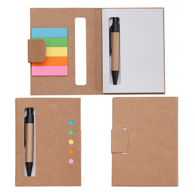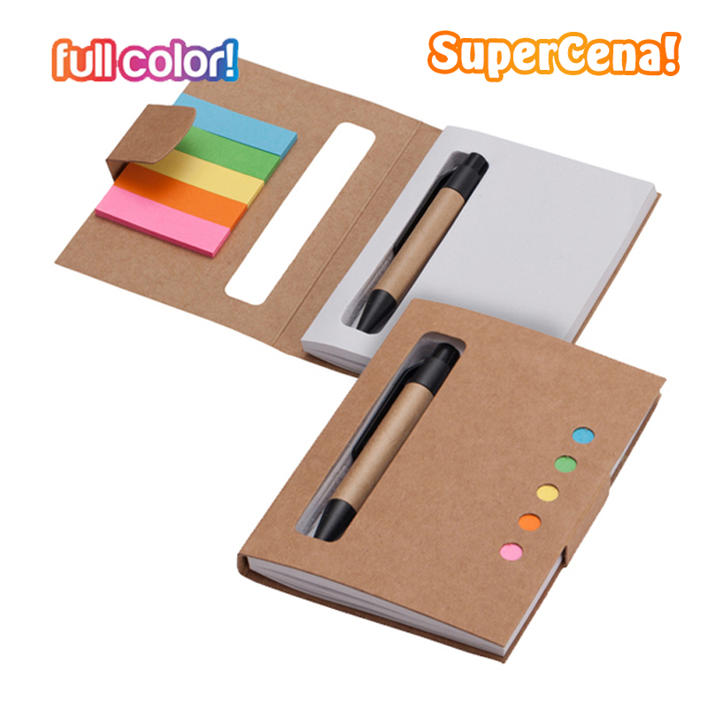 Mini notes w okładce z papieru o gramaturze 500 g/m2. Zawiera 100 białych gładkich kartek (80 g/m2) o wymiarze 78x107 mm, 5x25 szt. karteczek samoprzylepnych (80 g/m2) o wymiarze 12x45 mm oraz kartonowy mini-długopis (87x10x12 mm) z plastikowymi elementami. Wkład w kolorze niebieskim. Rozmiar kieszonkowy.