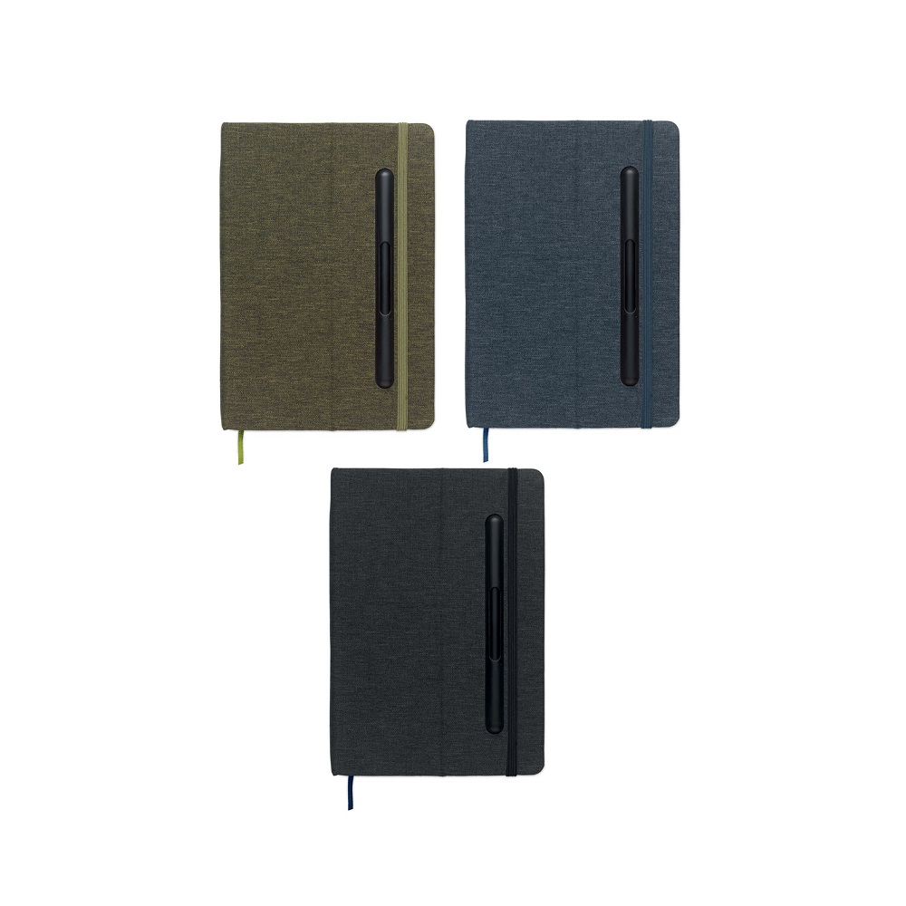 Notatnik A5 z twardą okładką z RPET z funkcją uchwytu na telefon. Zintegrowany długopis 2 w 1 z ABS. 192 strony w linie z papieru z recyklingu (96 arkuszy). Dopasowana gumka zamykająca i zakładka z tasiemki.