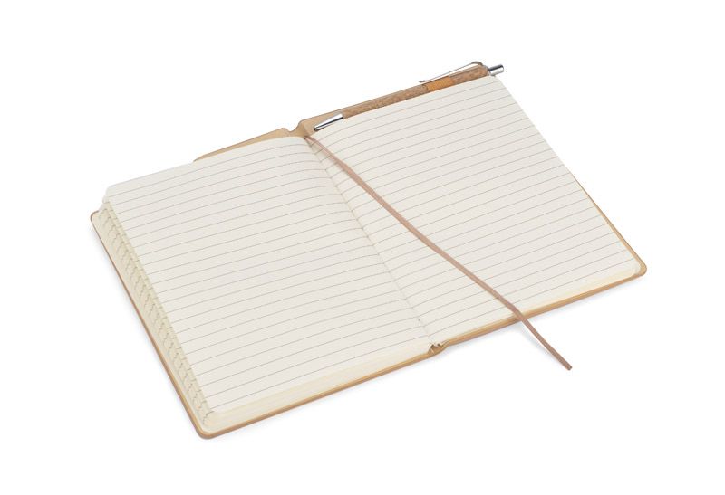 Notes TESSO w ekologicznej okładce wykonanej z naturalnego korka. Do notesu dołączony jest długopis z niebieskim wkładem. Korpus długopisu także został wykonany z korka co tworzy spójną całość. Umieszczony jest w specjalnie wyprofilowanym miejscu. Format notesu A5, 70 kartek w linie.