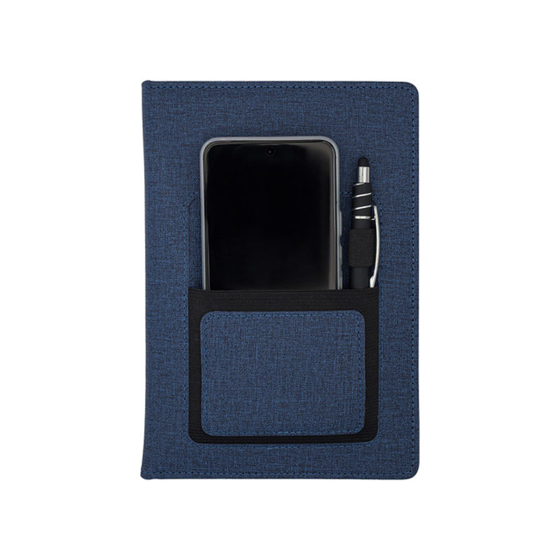 Notes wielkości A5 wyposażony w elastyczną kieszeń, która dopasowuje się do wielkości telefonu. Elegancka sztywna oprawa. 80 kartek w linię, gramatura 80 g/m2. Elastyczny uchwyt na długopis.