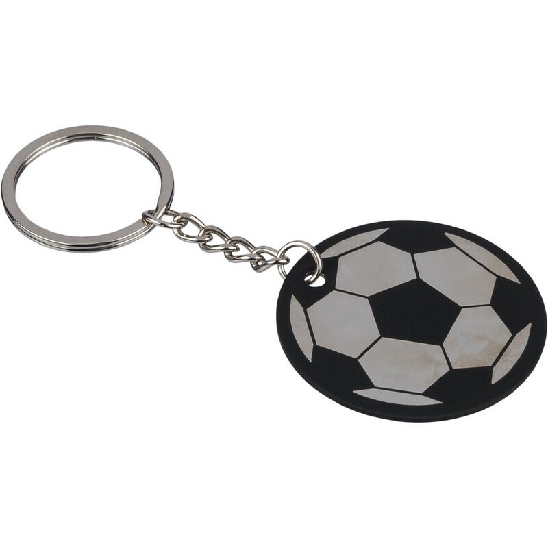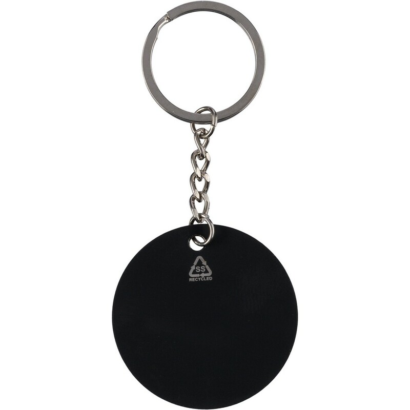 Okrągły brelok do kluczy w kształcie piłki nożnej, ikona recyklingu na produkcie, zapakowany w kraftową kopertę, produkt wykonany ze stali nierdzewnej z recyklingu