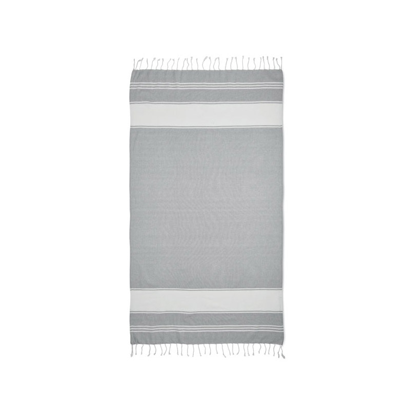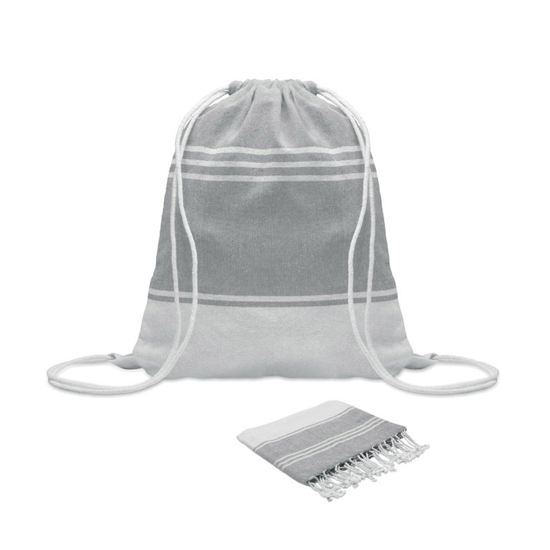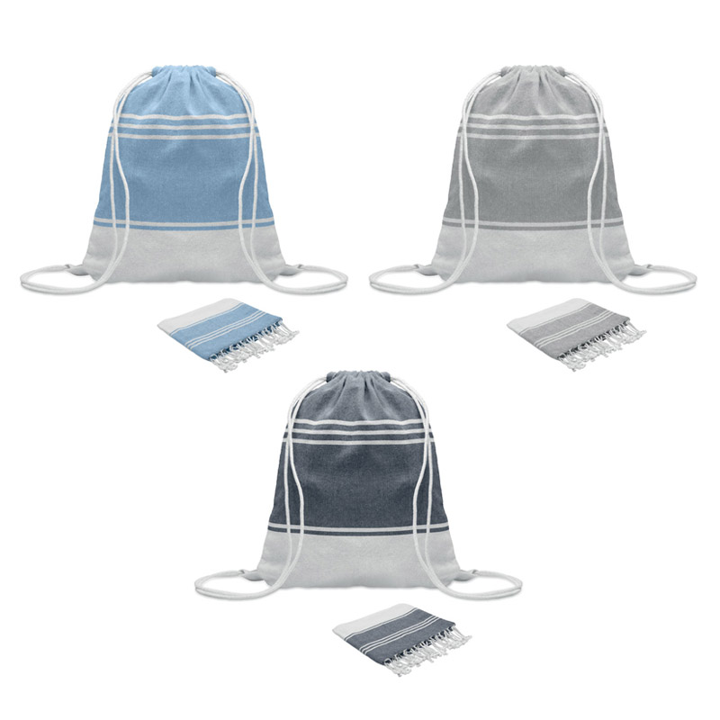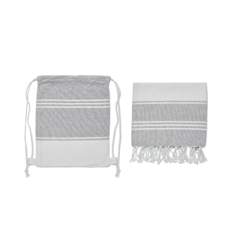 Zestaw z ręcznikiem plażowym hammam z workiem ze sznurkiem. 70% bawełna z recyklingu i 30% poliester z recyklingu 180 gr/m². 90x160 cm.