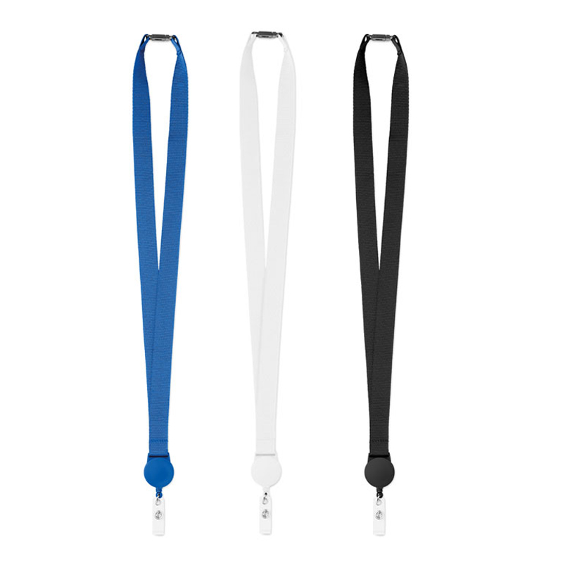 Smycz z poliestru z wysuwanym uchwytem na identyfikator oraz złączką bezpieczeństwa. Znakowanie sublimacją jest możliwe tylko na białych produktach.