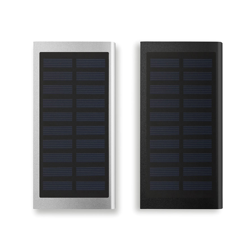 Power bank 8000 mAh z aluminium z recyklingu i panelem słonecznym. Pojemność do smartfonów, prąd wyjściowy DC5V/1A i DC5V/2A. Zawiera lampkę kontrolną i kabel USB z wtyczką micro USB.