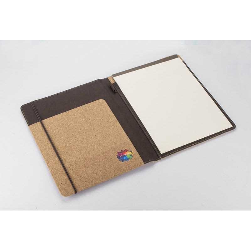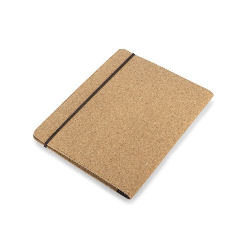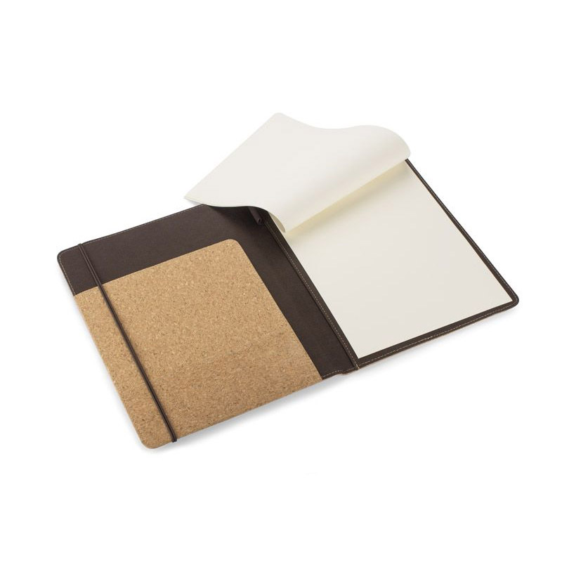 Korkowa teczka A4 z notatnikiem. Zawiera dużą kieszeń do przechowywania dokumentów, dwie mniejsze kieszonki oraz miejsce na długopis. Zamykana za pomocą gumki z metalowym elementem. Zapakowana w woreczek non woven.