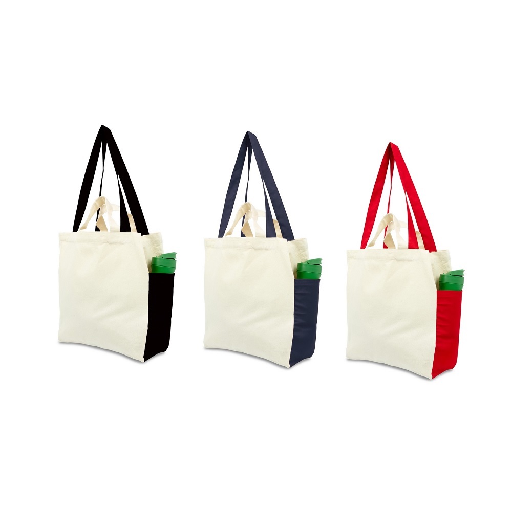 Torba na zakupy, posiada krótkie uchwyty oraz długie uchwyty umożliwiające noszenie na ramieniu, 2 kieszenie boczne dopasowane kolorystycznie do długich uchwytów, produkt wykonany z bawełny o gramaturze 240 g/m2