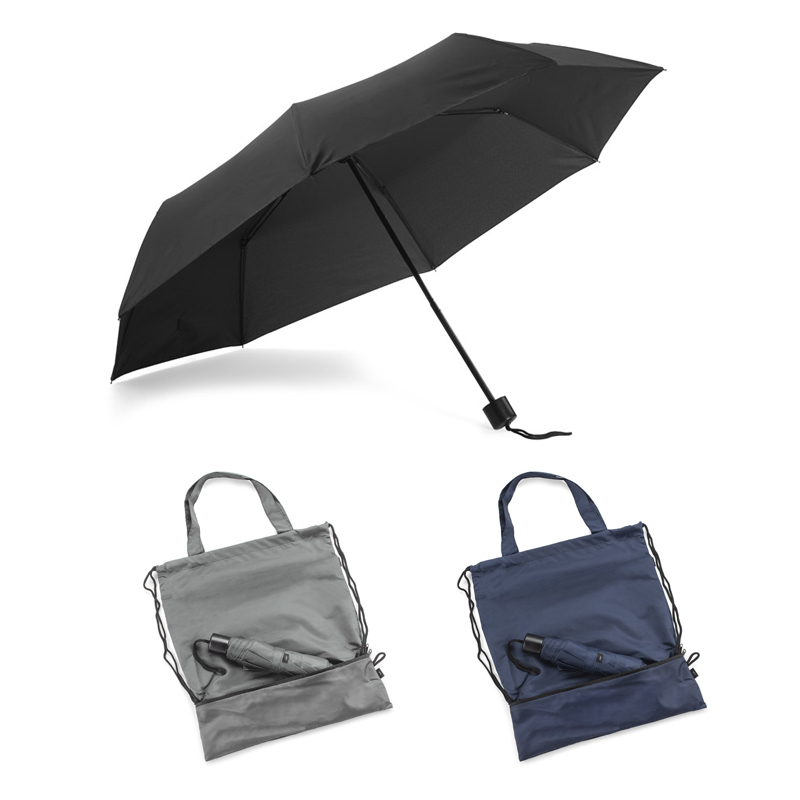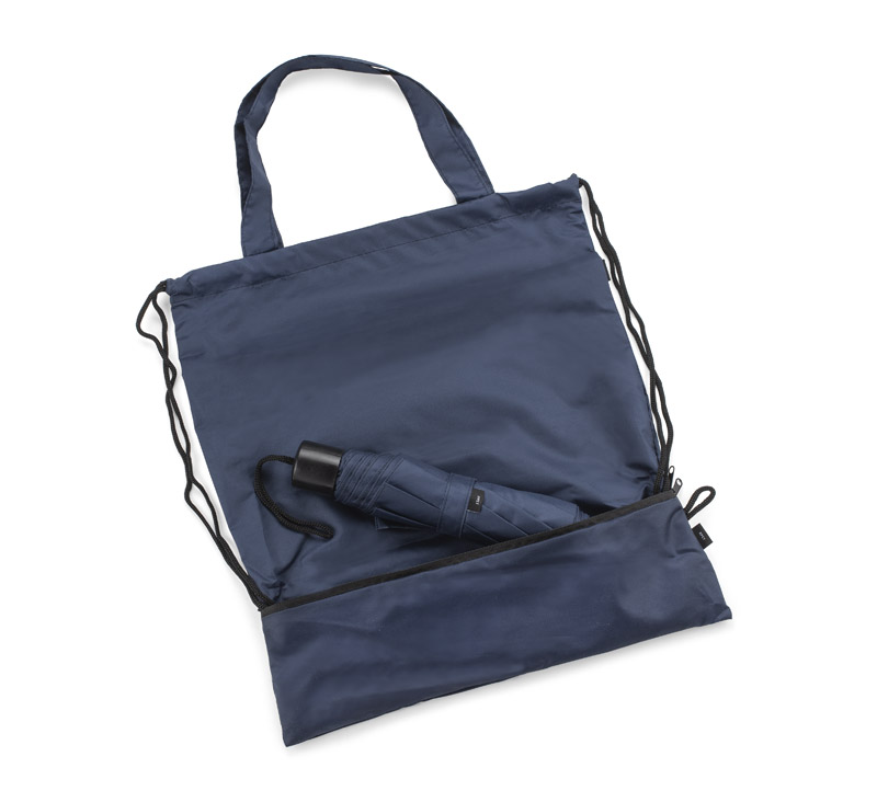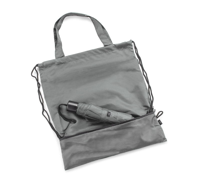 Worek na sznurkach z parasolem RAINY wykonany jest z poliestru RPET, co czyni go bardziej przyjaznym środowisku. Środek worka jest jednokomorowy. Oprócz tradycyjnych sznurków posiada jeszcze rączki o długości 44 cm, dzięki czemu może być używany także jako torba na zakupy. Na dole worka znajduje się zamykana na zamek kieszeń, w której schowany jest dołączony do zestawu parasol, także wykonany z poliestru RPET.