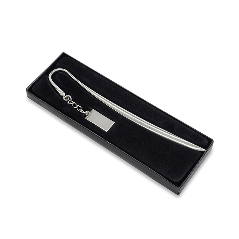 Metalowa zakładka do książki z zawieszką idealną do znakowania grawerem. Pakowana w czarne pudełko upominkowe.