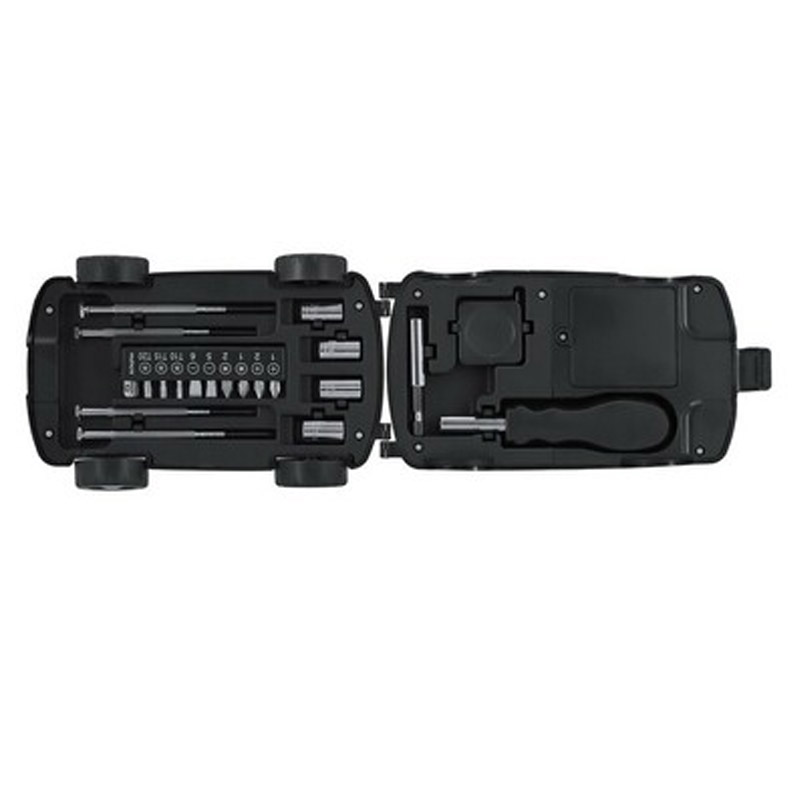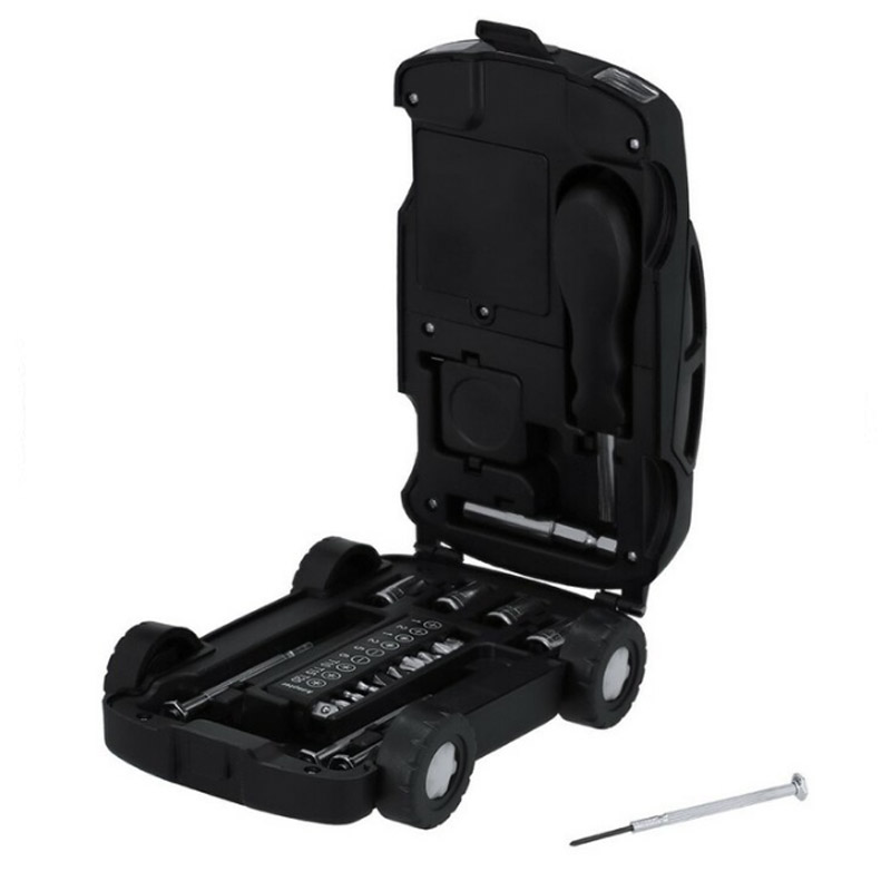Zestaw narzędzi w opakowaniu w kształcie samochodu, 20 elementów, miara 1m, rączka śrubokręta, 9 końcówek wkrętakowych, 4 precyzyjne śrubokręty, posiada lampkę 2 LED, produkt wykonany z ABS