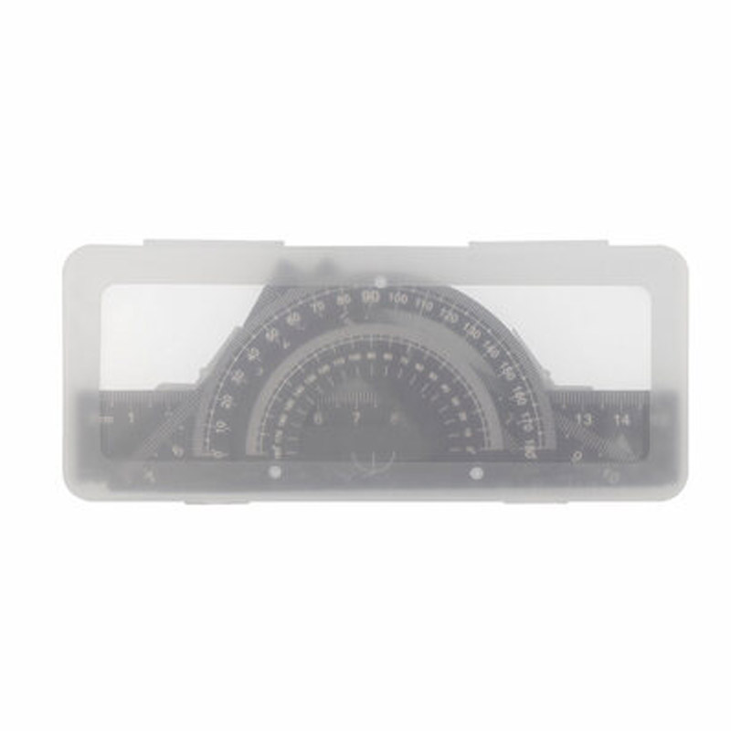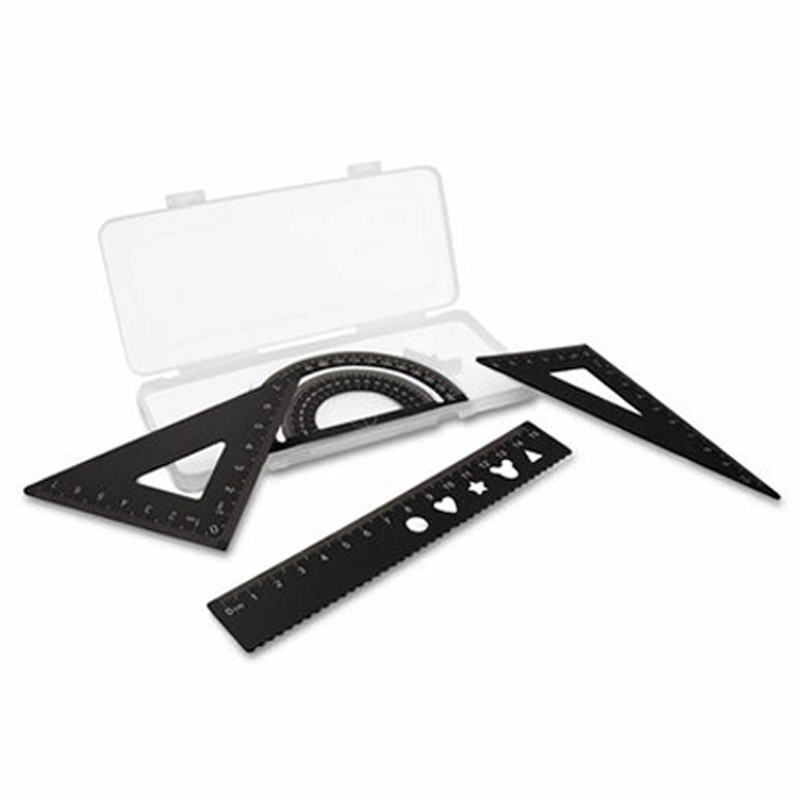 Zestaw szkolny, linijka, 2 ekierki i kątomierz w pudełku o mlecznobiałym wykończeniu, produkt wykonany ze stopu aluminium oraz plastiku