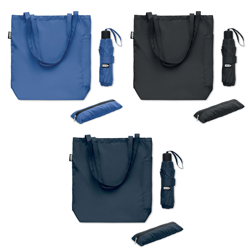 21-calowy, 3-krotnie otwierany i zamykany ręcznie wiatroodporny parasol z materiału 190T RPET pongee, z pokrowcem. Posiada ukrytą komorę zapinaną na zamek błyskawiczny do przechowywania parasola i utrzymywania suchej zawartości torebki. Gdy torba nie jest używana, zwija się, a przegroda na suwak działa jak pokrowiec na parasol.